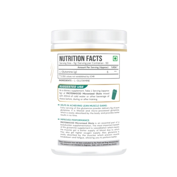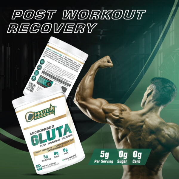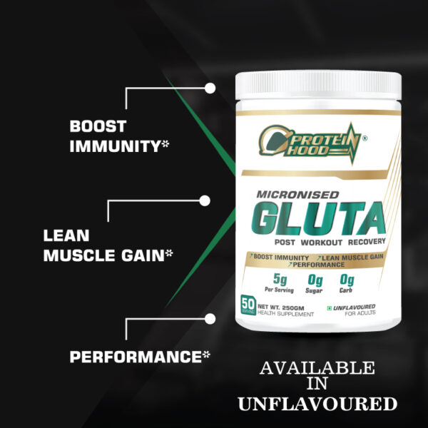 Speed up post-workout recovery with Protein Hood Gluta Micronised. Each serving provides 5g pure glutamine to support muscle repair, immunity, performance, and lean muscle gain. Zero sugar, zero carbs, unflavoured formula, 250g health supplement with 50 servings.