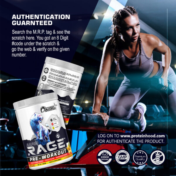 Unleash explosive training intensity with Protein Hood Rapid Rage Pre-Workout. Powered by Beta-Alanine, AAKG, and Taurine, this formula delivers multi-phase energy, razor-sharp focus, and increased power for peak performance. 300g health supplement for serious athletes.