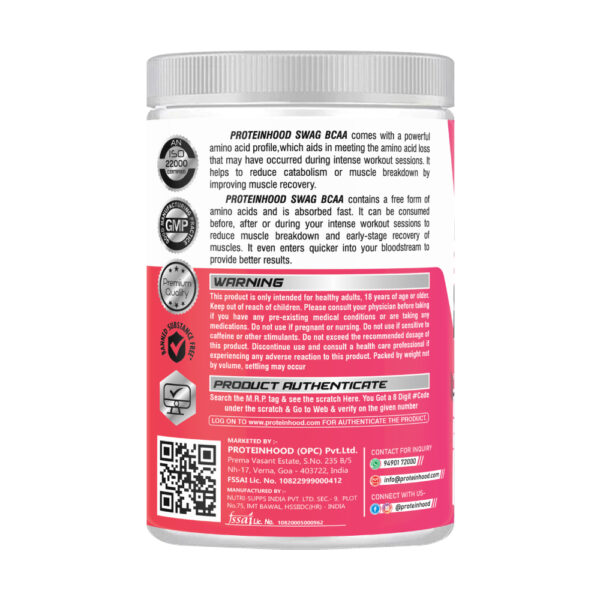 Improve muscle recovery and performance with Protein Hood SWAG BCAA. Each serving delivers 7g BCAAs, 1.5g L-Glutamine, and 500mg L-Citrulline for enhanced recovery, reduced muscle breakdown, and superior muscle support. 300g nutraceutical formula.